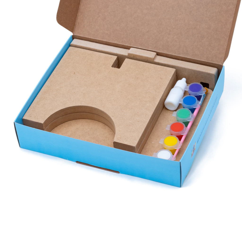 Conjunto de peças para montar um banquinho. São 4 peças em MDF, 6 cores de tinta atóxica e pincel para colorir. O que inclui: 2 laterais/pés do banquinho,1 centro/conexão, Manual de montagem, 1 assento, Cola atóxica, Pincel e Seis cores de tinta guache atóxica.