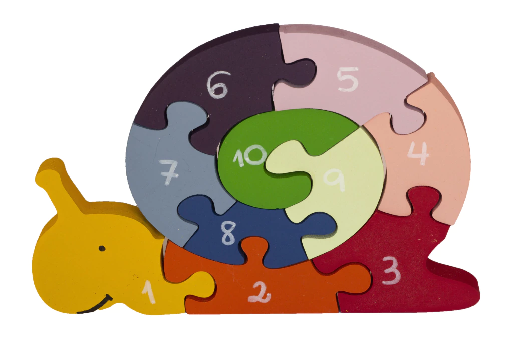 Quebra-cabeça educativo em formato de caracol, com dez peças coloridas enumeradas de 1 a 10. Brinquedo confeccionado em madeira de reflorestamento e pintado com tinta atóxica.