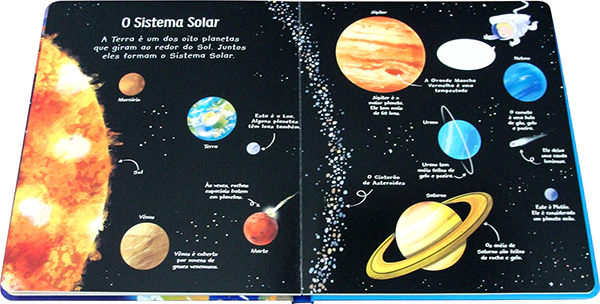 O Sistema Solar, a Lua, os planetas, a vida dos astronautas no espaço, os foguetes e muito mais!