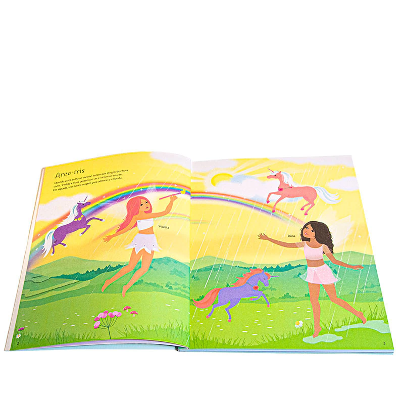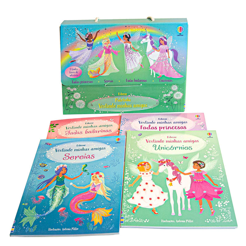 Esta maletinha contém quatro versões reduzidas dos livros de adesivos: Fadas bailarinas, Fadas princesas, Sereias e Unicórnios.